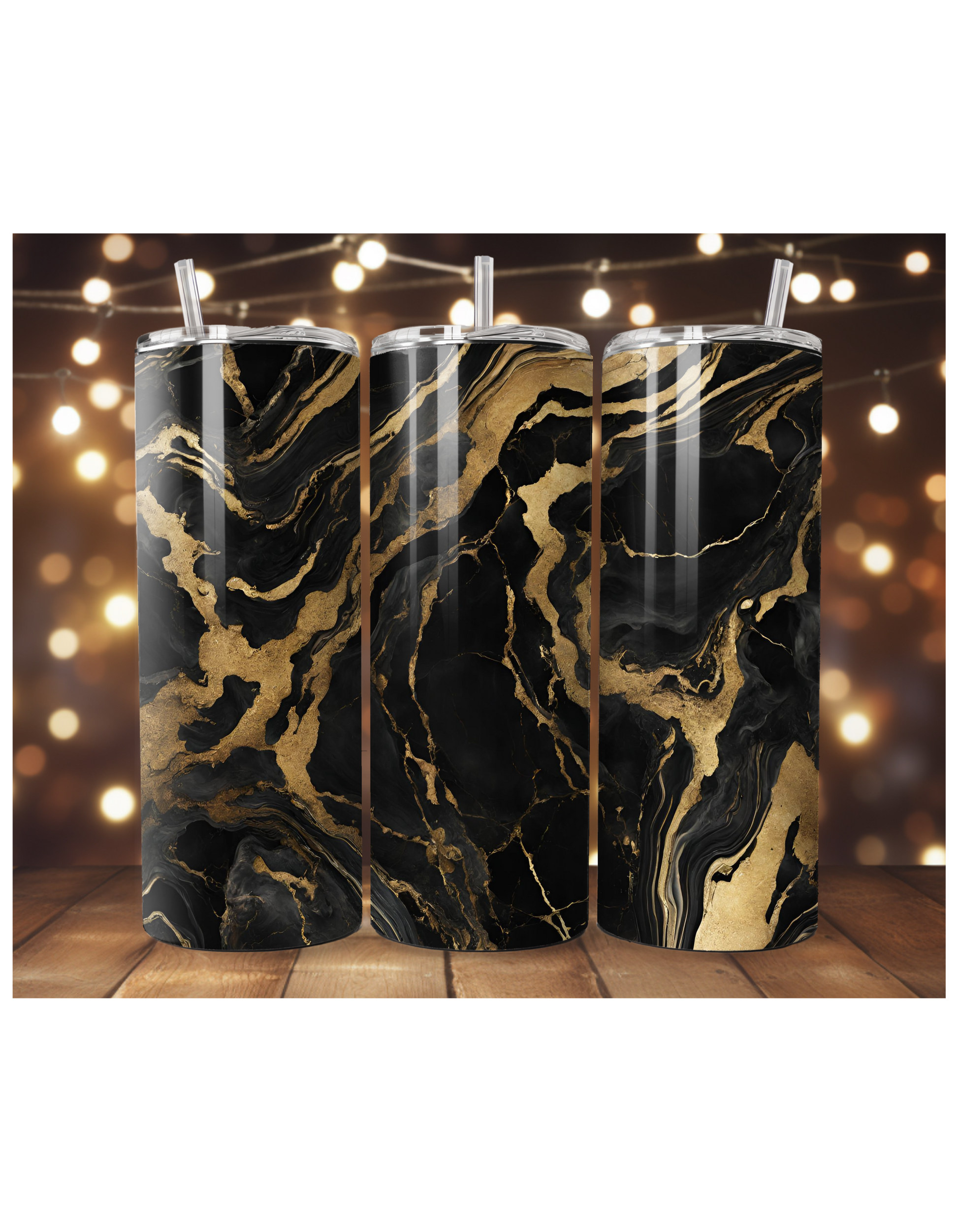 The 20oz Skinny Straight Tumbler, now available in a sleek black and gold marble design, is perfect for keeping your drinks at the ideal temperature while on the go. Its slim design is easy to carry and its durable construction ensures long-lasting use. Stay hydrated in style with this must-have tumbler.
